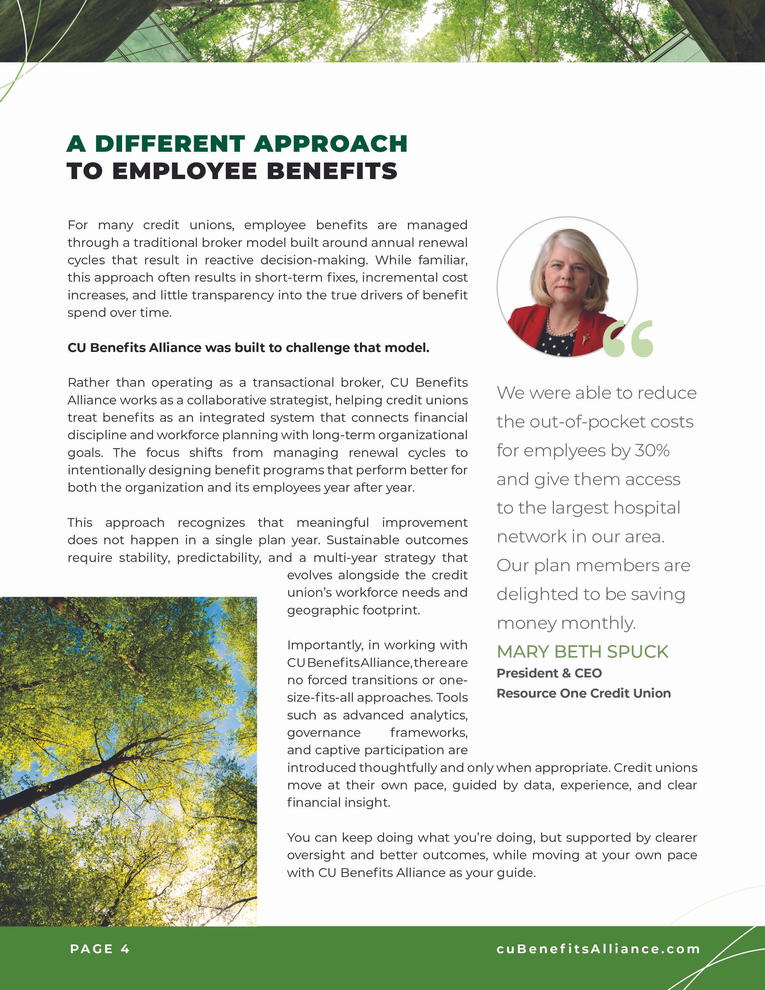 CU Benefits Alliance recognized that to compete effectively—particularly in response to the opportunity with FourLeaf Federal Credit Union—they needed more than a refreshed layout. They needed a strategic proposal framework that conveyed trust, control, and executive confidence from the first page forward.