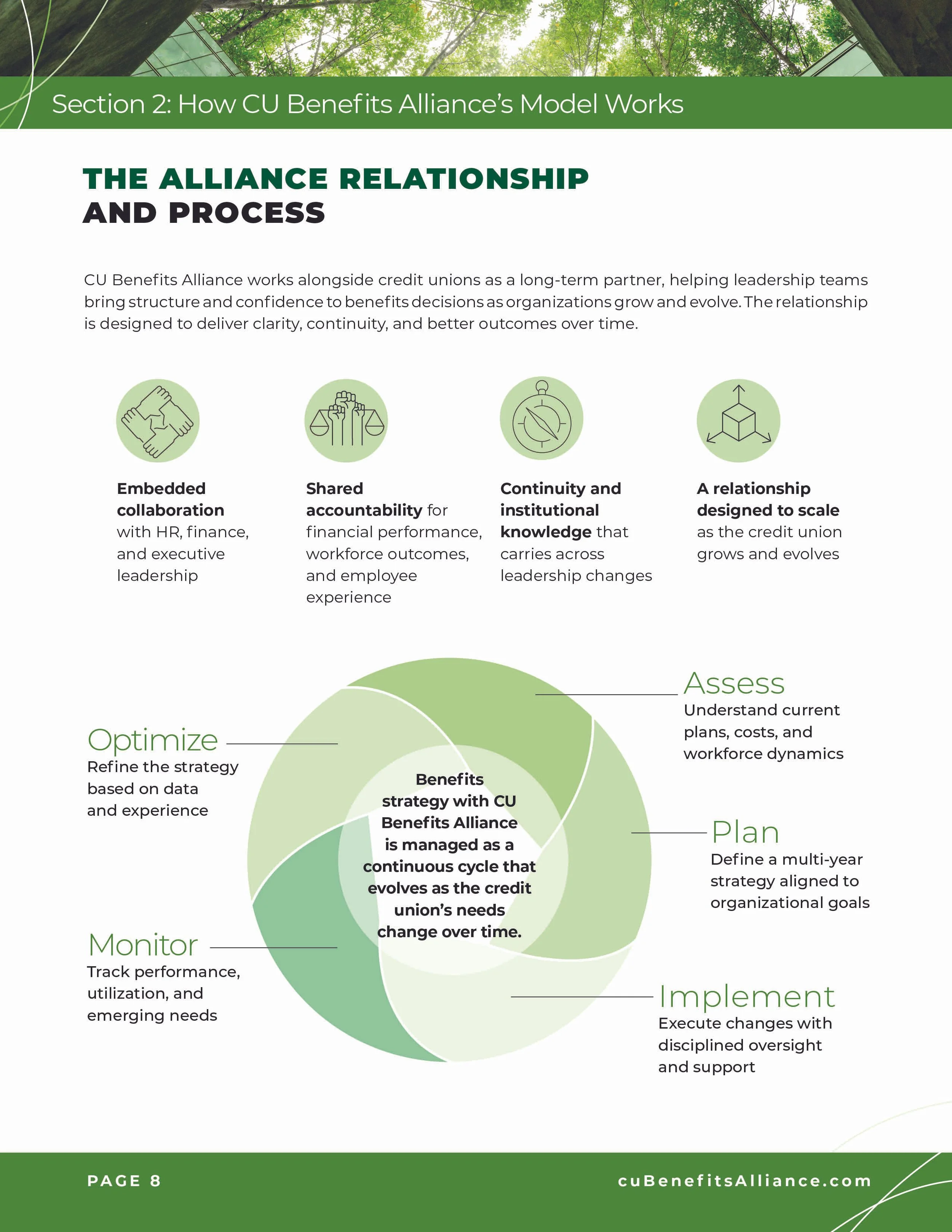 The result was not simply a redesigned document, but a scalable proposal architecture—one that aligned visual language, narrative tone, and executive expectations into a unified expression of strategic partnership. The collaboration with ContentOvation ensured that every visual element was underpinned by an executive-level narrative, reinforcing CU Benefits Alliance’s position as a strategic partner, not a broker, in every page and section.
